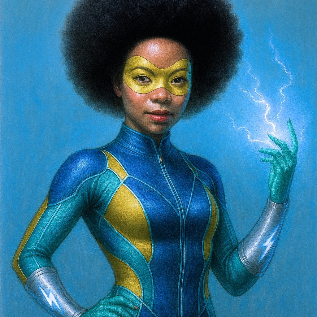 From a young age, Shocktress displayed an insatiable curiosity and a natural affinity for understanding the intricate dynamics of energy manipulation. Training relentlessly under her father’s guidance, she mastered the art of harnessing and controlling energy to manipulate lightning, soar through the skies, and wield incredible powers.